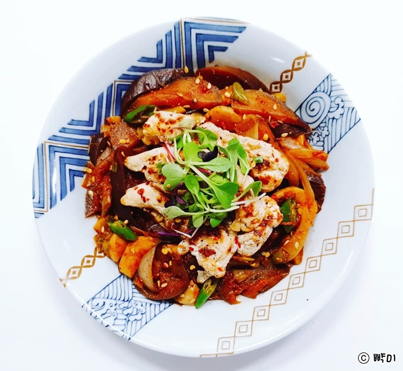 현미 귀리밥 100그램, 닭안심살 100그램, 가지 1개, 양파 30그램, 청양고추 1개, 대파 20그램, 다진 마늘 1/2큰술, 코코넛 오일 1큰술, 물 80밀리리터, 크러쉬드 레드페퍼 약간, 아마 시드 약간, 새싹 한 줌