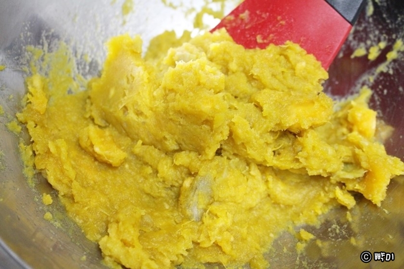 1. 깨끗이 씻은 고구마는 찜통에 넣고 쪄 준후 식혀서 껍질을 벗기고 포크로 으깨주세요.