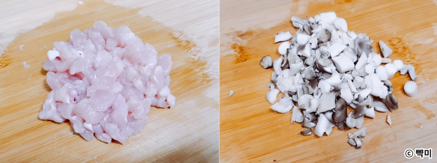 1. 냉동 닭가슴살은 해동시킨 후 먹기 좋은 크기로 잘라주고 손질한 시금치와 버섯은 한 입 크기로 썰고 마늘은 편 썰어주세요.