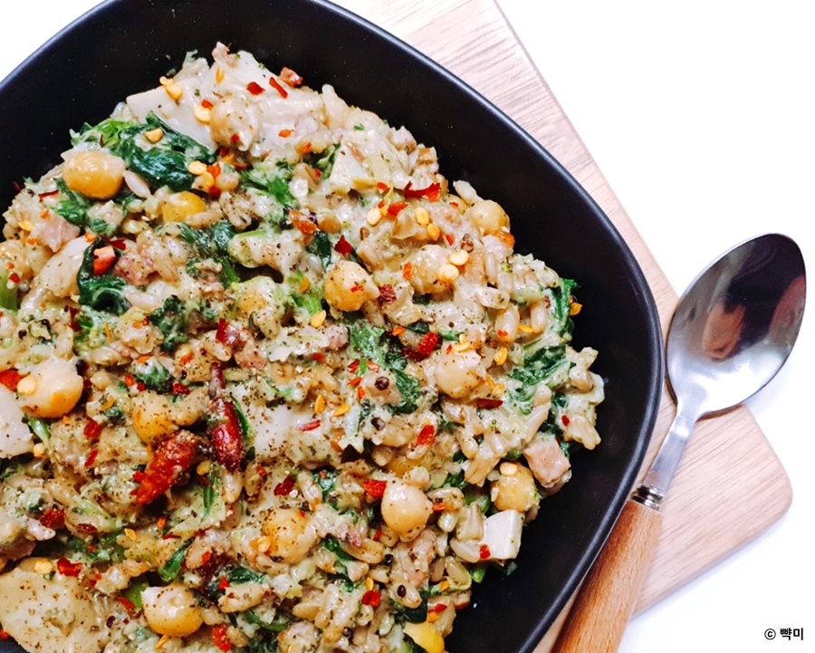 4. 완성된 리조또는 그릇에 담고 취향에 따라 크레쉬 드레드 페퍼, 후추, 파슬리가루 등을 뿌려주세요.